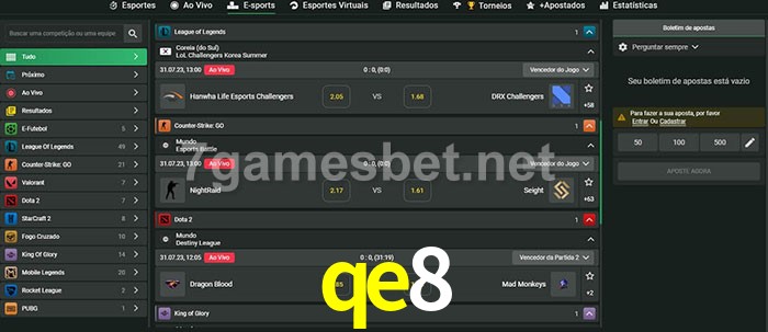O qe8 oferece uma grande seleção de opções de apostas em e-sports com probabilidades competitivas